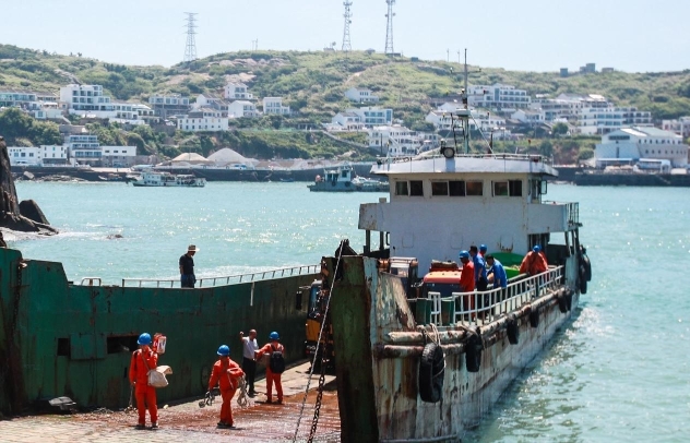9月14日上午,在宁波市象山县,鹤浦供电服务站员工叶维杰、金礼挺等5人背上绝缘梯,肩挎抢修工具包,赶向金高椅渡海码头,乘船出海入驻花岙岛,开展海岛线路巡视并做好抢修准备,直至台风预警解除。