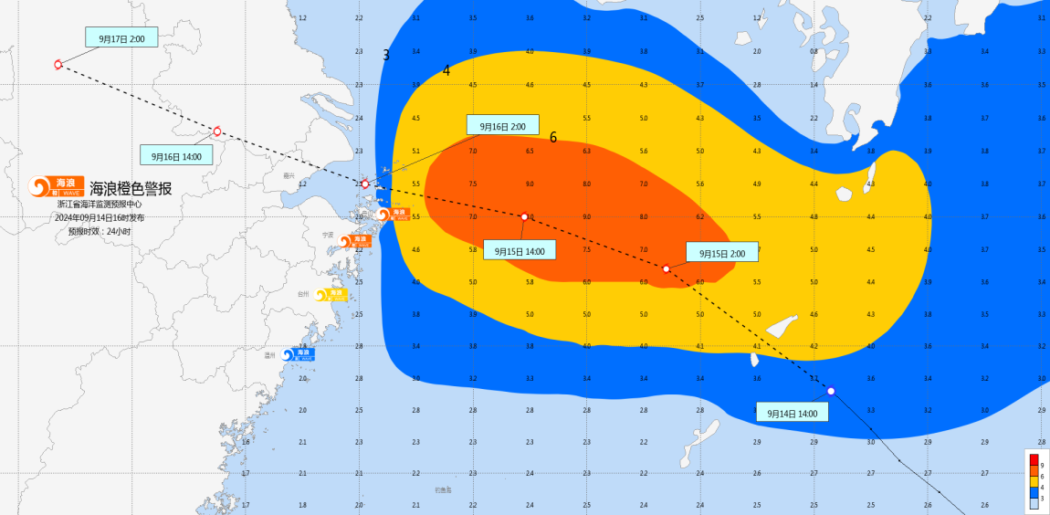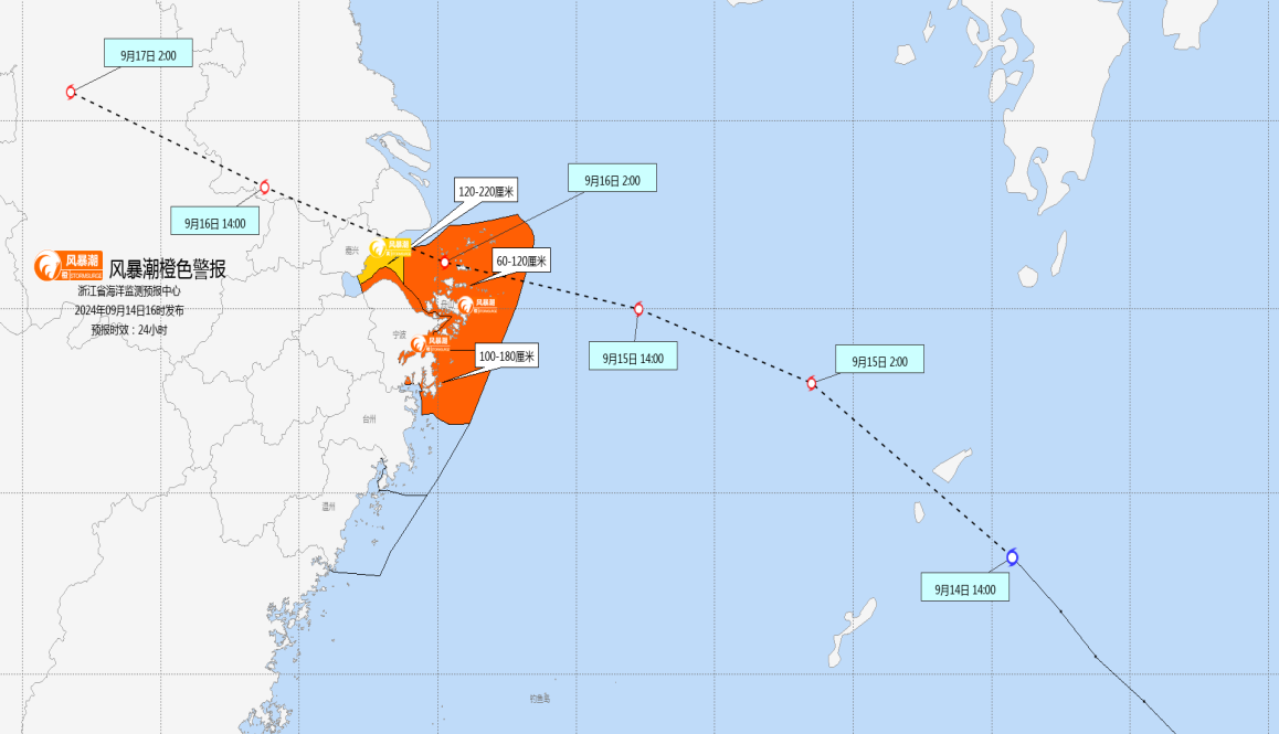 9月14日傍晚,浙江省海洋监测预报中心根据《海洋灾害应急预案》发布风暴潮橙色警报、海浪橙色警报。