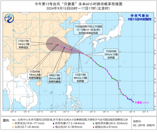 预计,“贝碧嘉”将以每小时20-25公里的速度向西偏北方向移动,强度将继续增强,逐渐向华东沿海靠近,并将于15日夜间至16日上午在浙江宁波到江苏启东一带沿海登陆(台风级或强台风级,12~14级,35~42米/秒),登陆后强度逐渐减弱。
