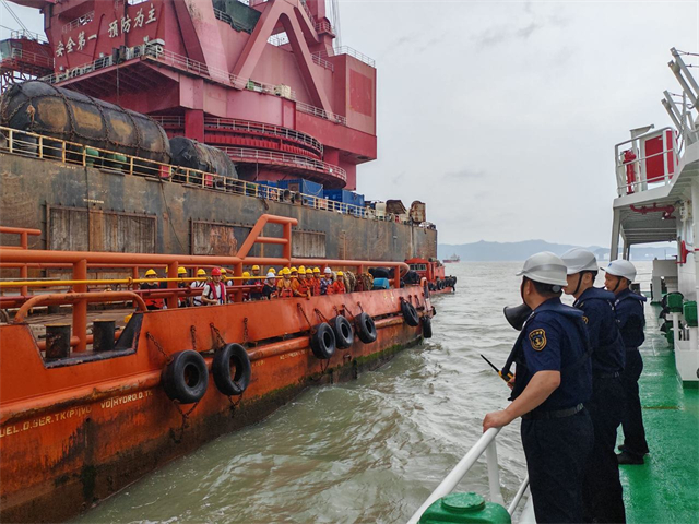 海事执法人员对在大麦屿锚避风的船舶开展安全提醒 来源:浙江海事局