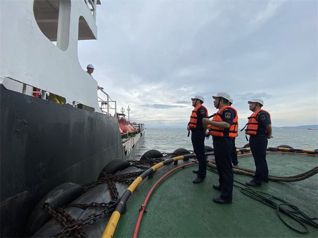 海事执法人员检查锚地锚泊船舶避风情况 来源:浙江海事局