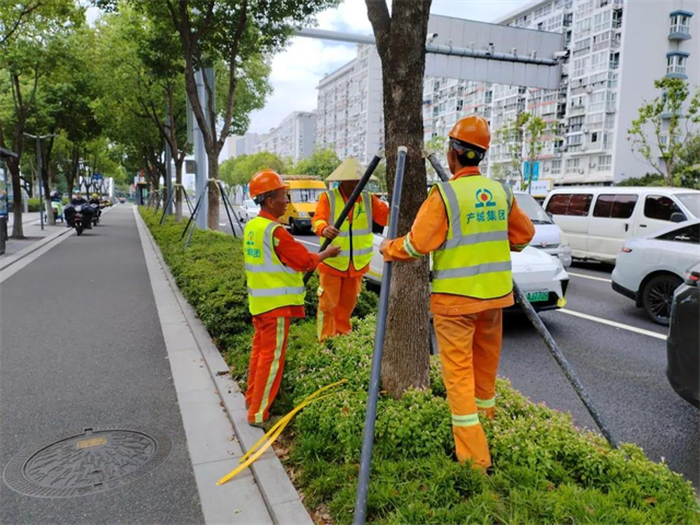 园林工人忙着加固行道树。通讯员供图