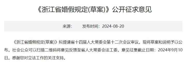 8月20日,《浙江省婚假规定(草案)》在省人大官网公开征求意见,并拟提请省十四届人大常委会第十二次会议审议。