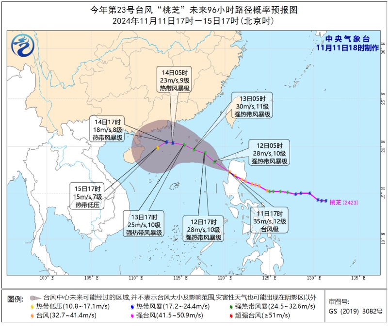 今年第23号台 风“桃芝”路径概率预报图。图源:中央气象台