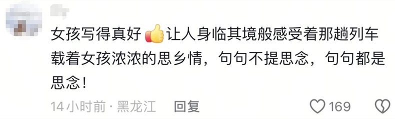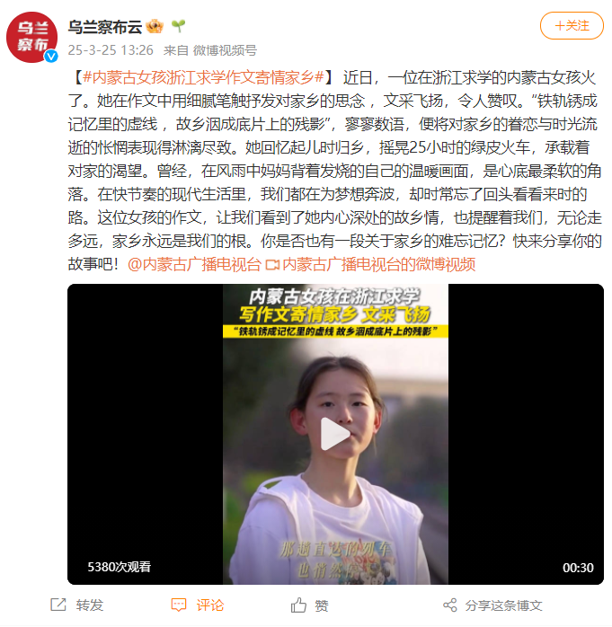 前几天,杭州丁兰实验中学的老师王杨军在他的个人平台“语文山水”发布了一则视频:在杭州上学的内蒙古女孩张潇冉,写出一篇《旧轨还乡》,记录自己和家里的老人乘坐火车一起回家的情形,让老师在批阅作文时深受感动,决定让她在课上读给同学们听。