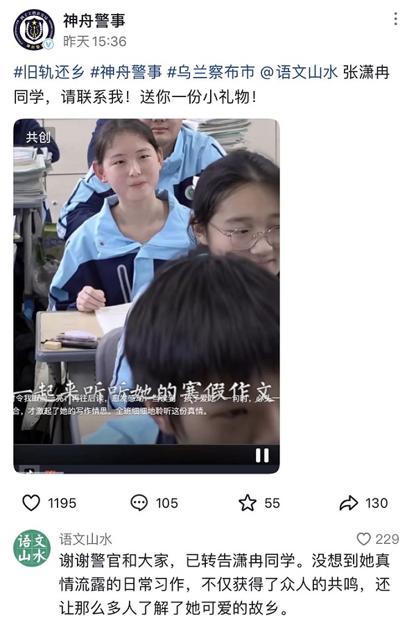 这次张潇冉的视频在“山水语文”一发出就感动了无数网友。王老师说,“有个当地的官方账号联系我,想给她赠送一份礼物,我也跟他交流了一下,表示了感谢。”
