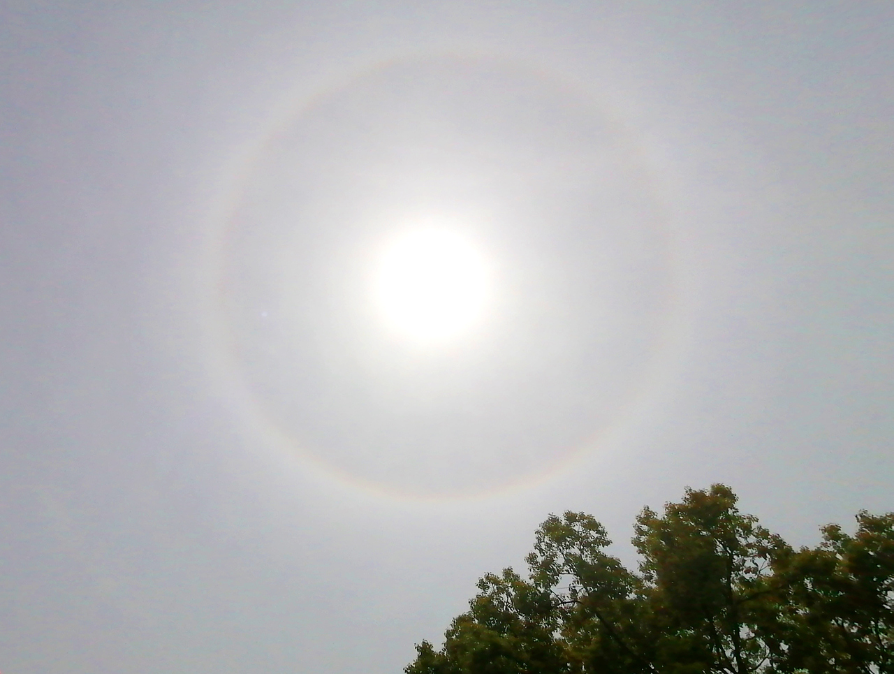 日晕,又叫圆虹,是一种大气光学现象,是太阳光在卷层云中被冰晶折射或反射而形成的巨大彩色光环,云层中冰晶含量越大,光环也就越明显。日晕多出现于春夏季节,民间有“日晕三更雨,月晕午时风”的谚语,日晕在一定程度上可以成为天气变化的一种前兆。