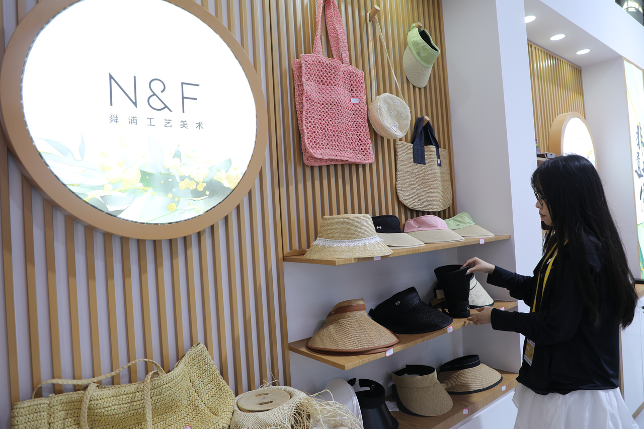 在浙江形象展区,浙江舜浦工艺美术品股份有限公司的草编帽、草编手袋等非遗产品聚拢了人气。