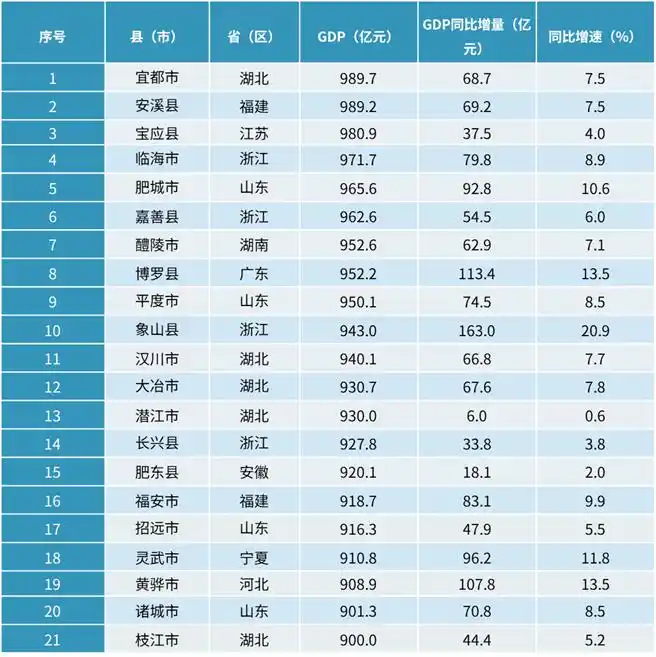 2024年,全国GDP超900亿元的准“千亿县”达到21个。其中,浙江有4个准“千亿县”正蓄势待发,距离“千亿县”只差临门一脚。