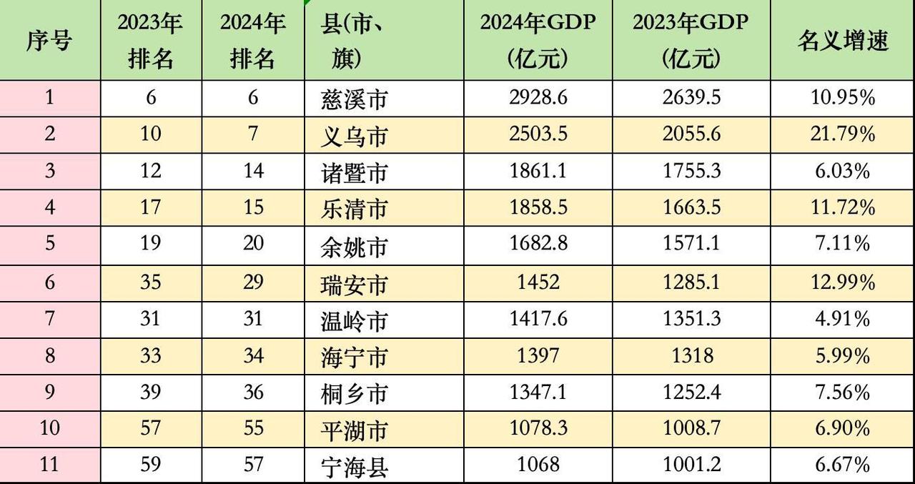 浙江11个县(市)上榜,并贡献了1.86万亿元GDP。其中义乌市2024年GDP同比增量447.9亿元、名义增速21.8%,均位列千亿县第一位。