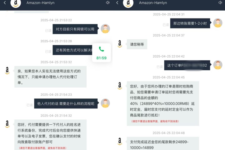 随后,李女士扫描了网友提供的二维码,进入到一个看似“亚马逊”的平台聊天界面。