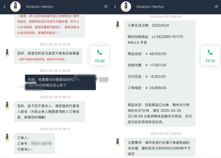 李女士回忆,她几年前在微博上结识了一位网友,双方偶尔保持联系。就在几天前,该网友突然联系李女士,称自己的系统有点故障,现在正在参与一个LV包包的限时抢购活动,过了时间就没有了,希望李女士能帮她支付25000元的尾款。