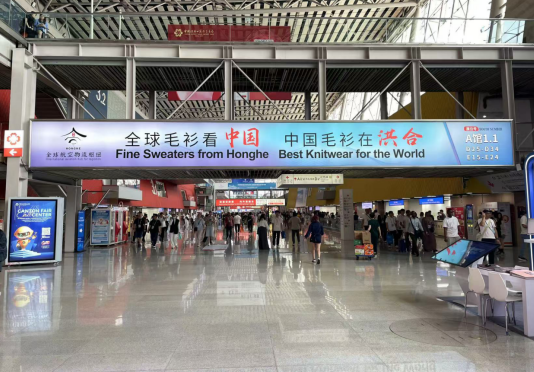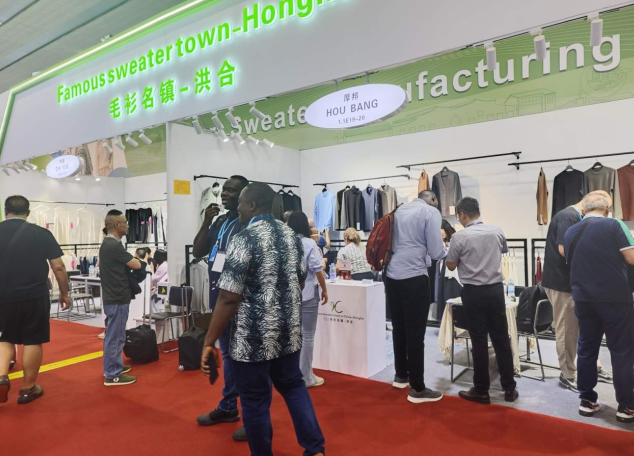 从户外展区走进室内的A展区,10多米长的巨型中英文海报——“全球毛衫看中国,中国毛衫在洪合”非常醒目。嘉兴洪合的特色毛衫产业在广交会集体亮相。