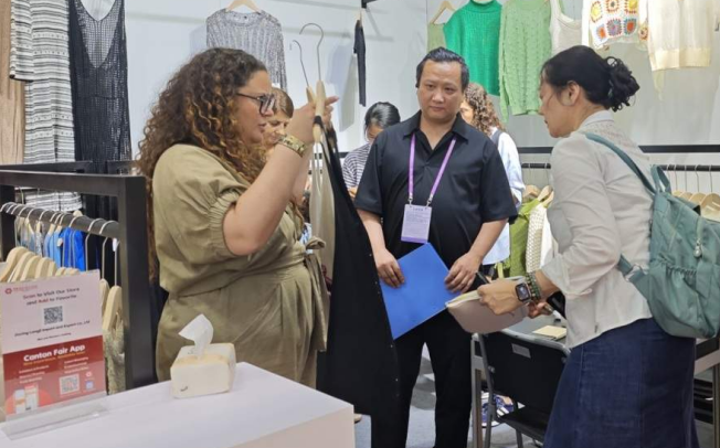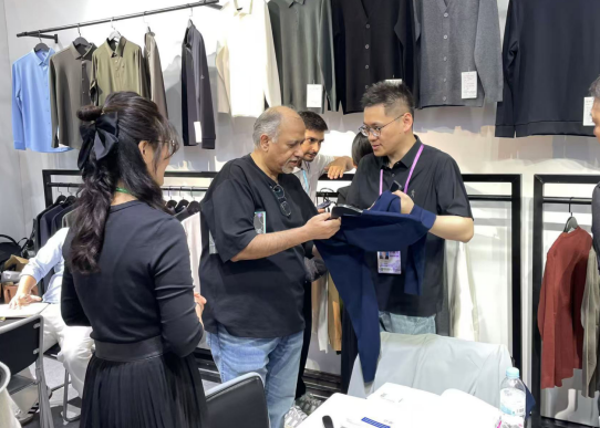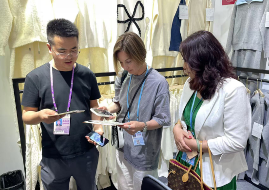 选款式、选面料,劳拉很快就向展位负责人陈磊提出了定制一款全丝面料短袖开衫的要求。“我喜欢丝绸衬衫的设计,它在英国也更受欢迎。如果他们制造的样品还不错,那我就可以下单了。”
