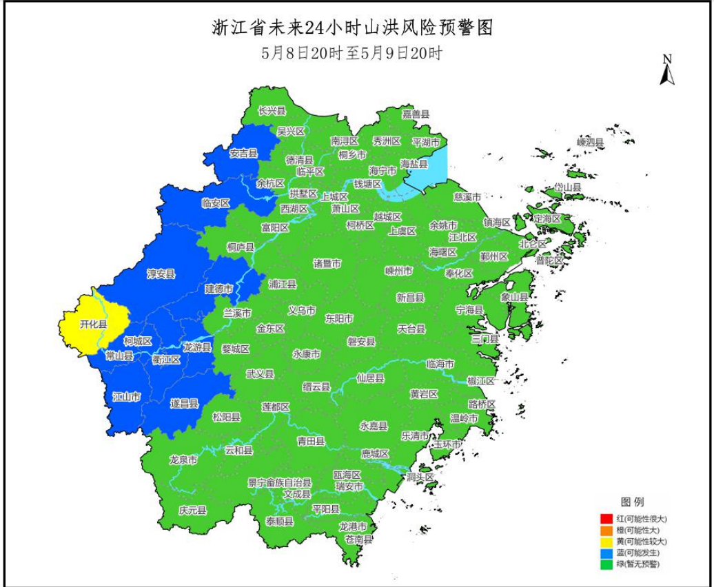 潮新闻讯 浙江省水利厅、省气象局5月8日16时59分联合发布山洪灾害预警:根据省气象台未来降雨预报,预计5月8日20时至5月9日20时,开化县发生山洪灾害可能性较大(黄色预警),临安区、淳安县、建德市、安吉县、柯城区、衢江区、常山县、龙游县、江山市、遂昌县可能发生山洪灾害(蓝色预警)。