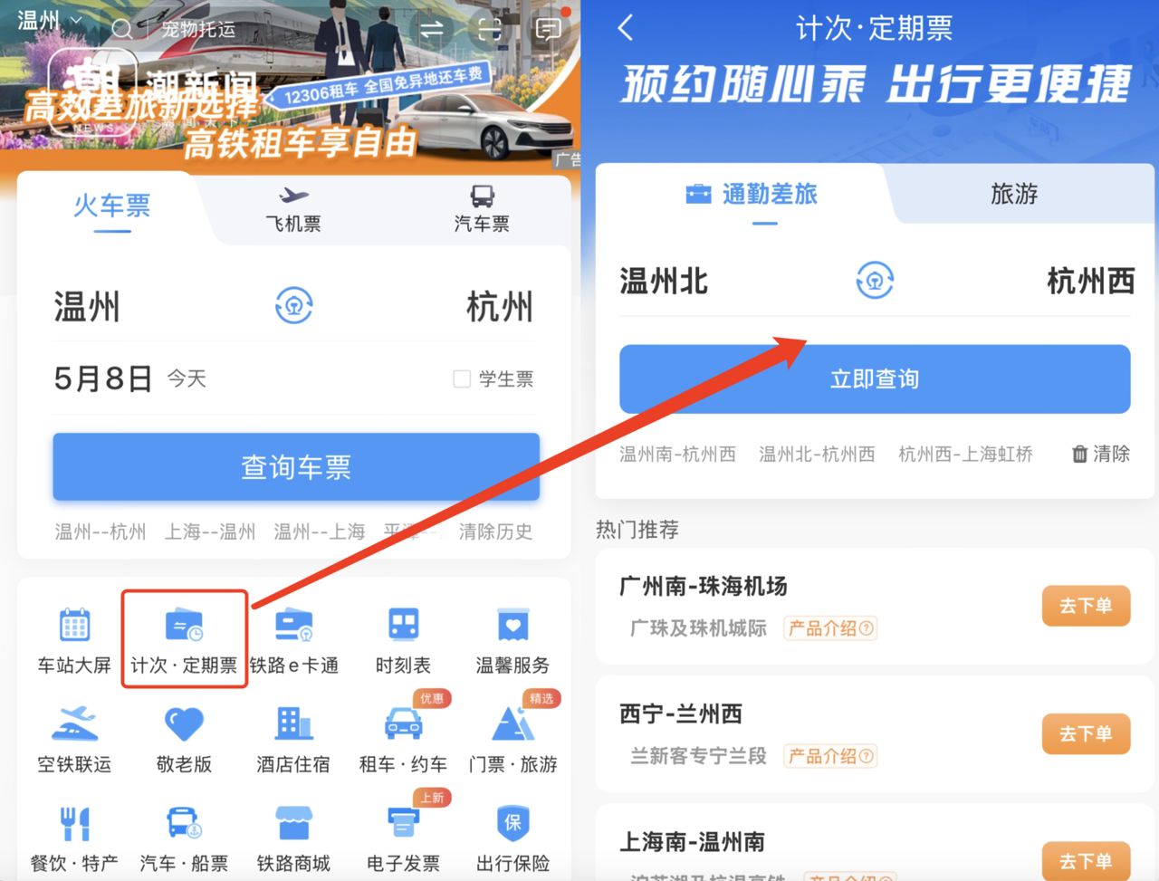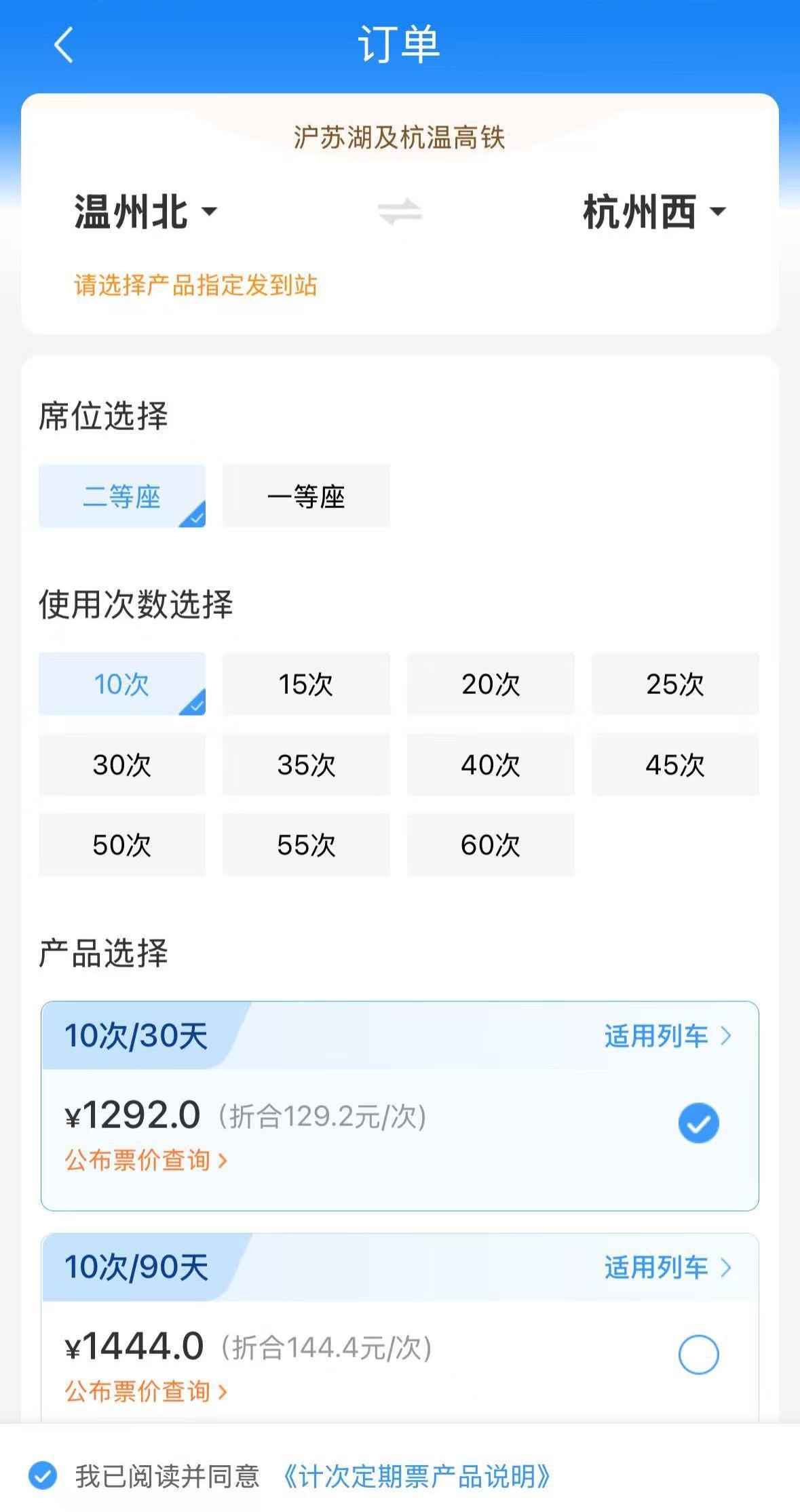 通过铁路12306手机APP,在页面选择“计次·定期票”,点击“通勤差旅”,输入出发站“温州北”和到达站“杭州西”,即可进入下单页面,再依次完成“席位选择”“使用次数选择”和“产品选择”,便完成了购票。