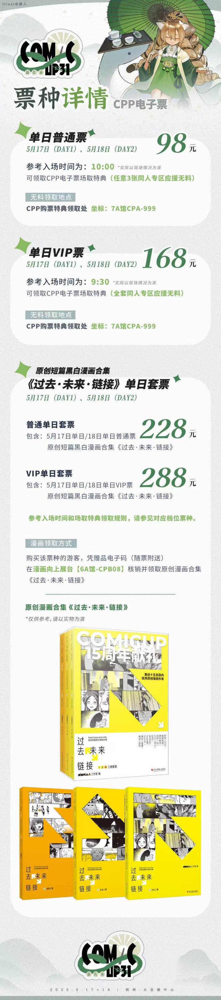 本次展会票种分为原创漫画《过去·未来·链接》普通单日套票、原创漫画《过去·未来·链接》单日VIP套票、单日普通票、单日VIP票三类,票价分别为228元、288元、98元、168元。CP31购票为强实名,需填写真实的身份信息及手机号,且购票后不支持更换身份证信息,且同一票种一个身份证限购一张。