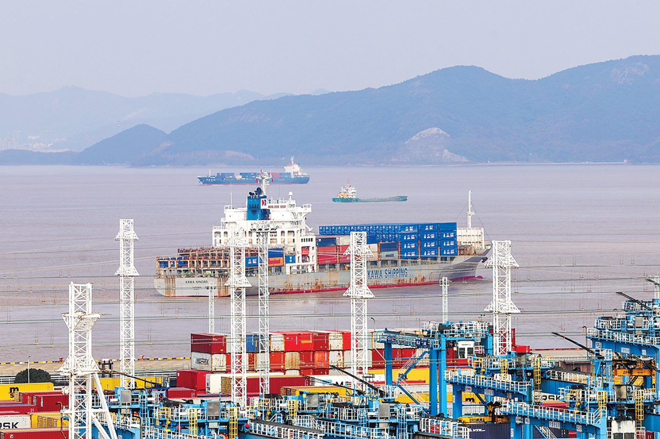 执行“中欧快航”航线首航的“嘉华宁波”轮启航驶离宁波舟山港穿山港区。 新华社记者 江汉 摄