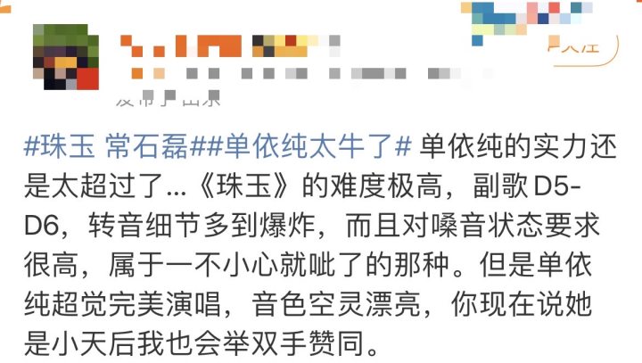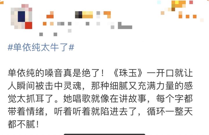 不少网友16日晚都被单依纯的歌声震撼了,“这个音色,一开口简直就像神女来涤荡我心灵了。刚知道单依纯要唱《珠玉》时还觉得直播难度太大很考验嗓子状态,现在看来完全是多虑,不是艺高人胆大,单纯就是对自己的实力足够自信”“单依纯的嗓音真是绝了!《珠玉》一开口就让人瞬间被击中灵魂,那种细腻又充满力量的感觉太抓耳了。她唱歌就像在讲故事,每个字都带着情绪,听着听着就陷进去了,循环一整天都不腻”好难唱的一首歌啊!那个转音转得我都要怀疑人生了,不愧是实力派专业歌手级别”……