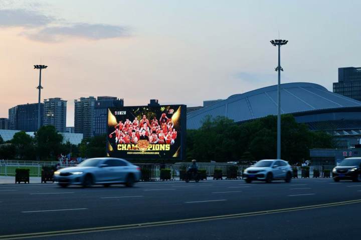 湖滨步行街,人流最集中的位置,大屏亮起了“恭祝浙江广厦勇夺2024-2025CBA总冠军”的祝福语;机场高速口,登上了巨幅广厦男篮总冠军海报;黄龙体育中心东广场大屏幕,庆祝海报在夜幕下格外亮眼。