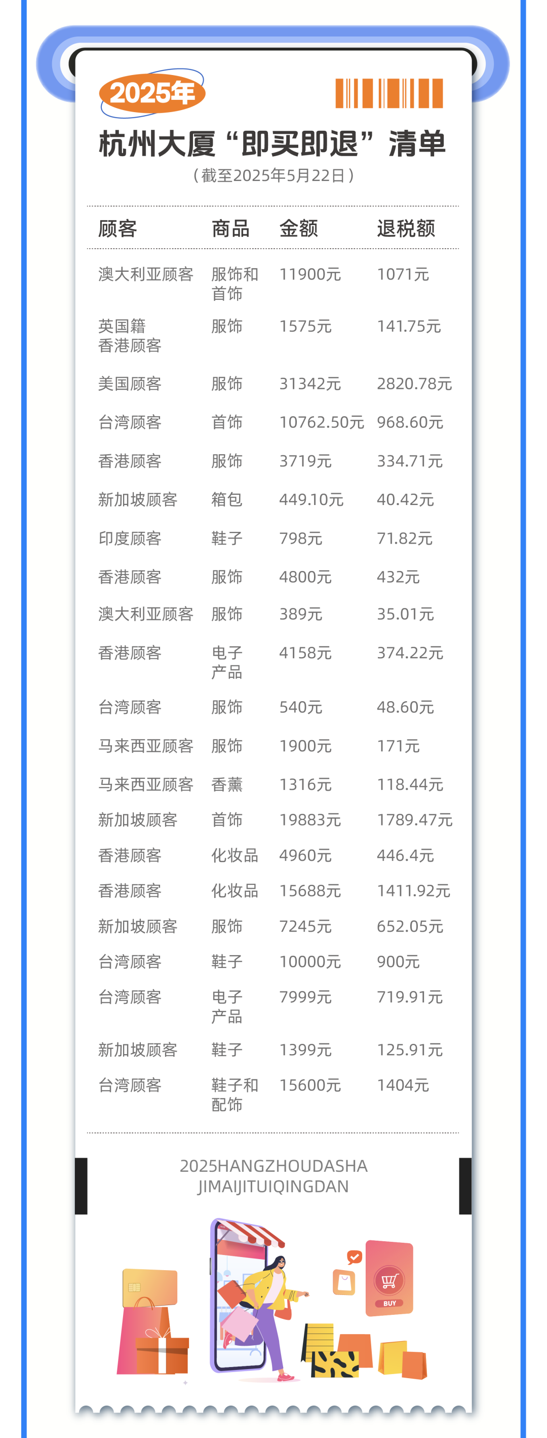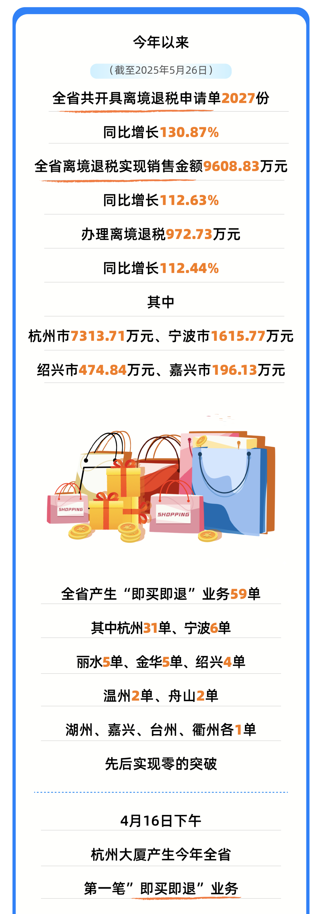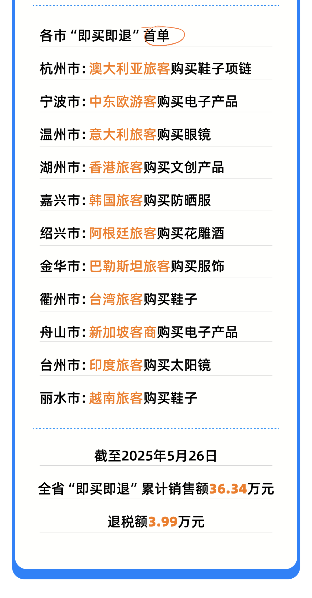 5月27日下午,浙江省文化广电和旅游厅发布离境退税“即买即退”政策全省商家名单,目前全省“即买即退”商店105家,比年初(14家)新增91家,已构建覆盖全省的退税网络。此前,国家税务总局对外发布公告,对离境退税“即买即退”的主要内容、办理流程和施行时间作出明确规定。该举措前期先后在上海、北京、广东、四川、浙江等地开展试点。