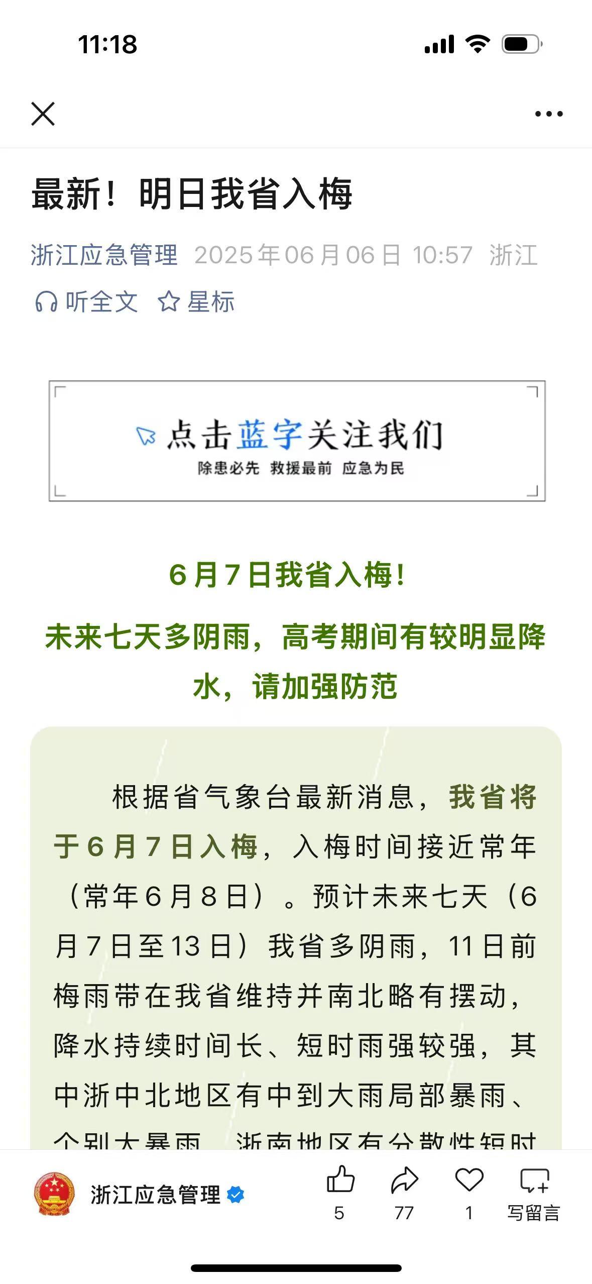 6月6日中午,“浙江应急管理”官方微信发布消息——