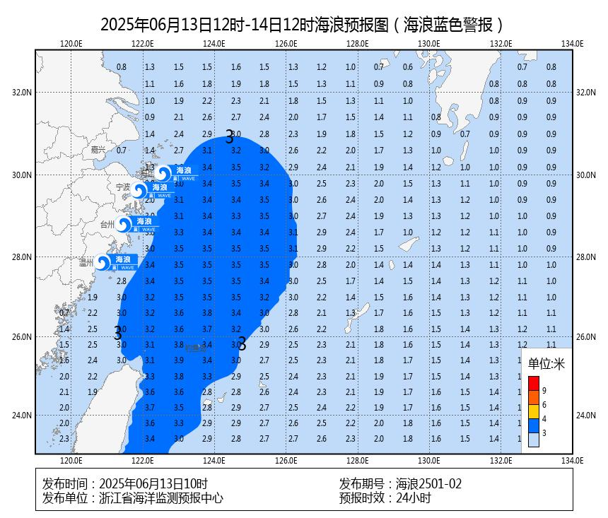 今天(6月13日)上午,浙江省海洋监测预报中心根据《海洋灾害应急预案》发布海浪蓝色警报。