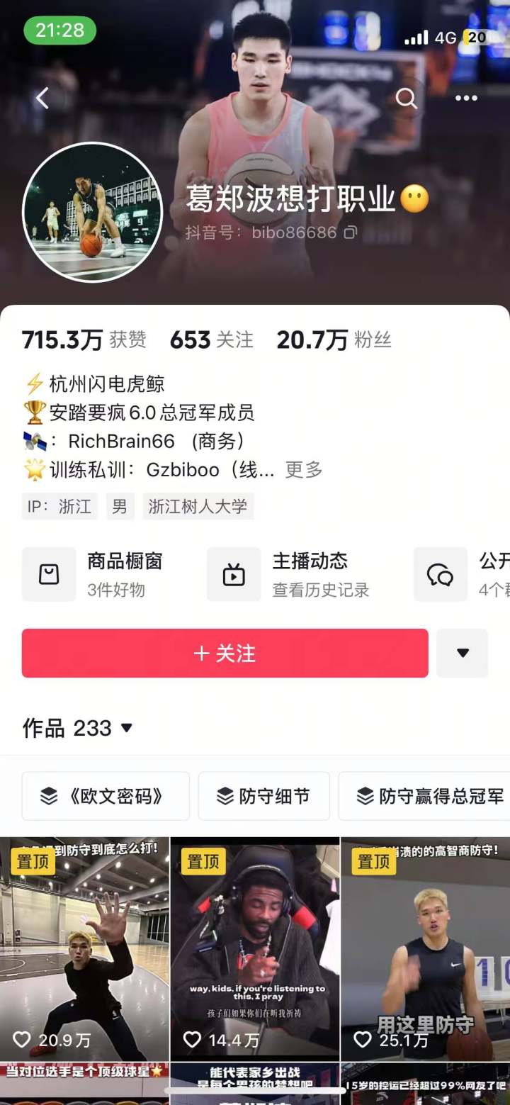 “葛郑波想打职业”在全网拥有21万粉丝。