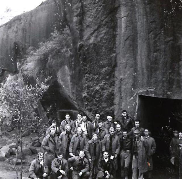 被营救的四个机组成员在衢州汪村衢州第十三航空总站防空洞前合影 图片由杜立特行动纪念馆提供