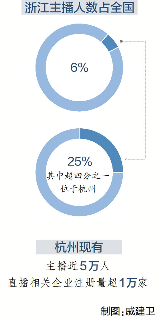 据杭州市商务局数据,杭州现有综合类、垂直类头部直播平台32家,主播近5万人,直播相关企业注册量超1万家,数量列全国第一,带动就业超100万人。