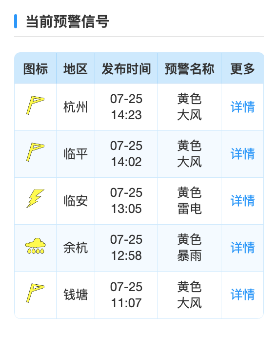 截至14:30,杭州主城区、临平、钱塘都已发布大风黄色预警,余杭发布暴雨黄色预警,临安发布雷电黄色预警。
