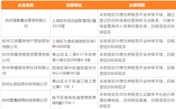 6月,联合检查小组通过线下抽查的形式开展住房租赁市场常态化检查,实地检查了51家住房租赁从业企业,对存在消防安全管理不到位、未及时挂牌租赁房源等违规问题的企业进行督促整改,并将杭州瑞雅置业管理有限公司、杭州万润嘉房地产营销策划有限公司等6家企业列入风险名单。