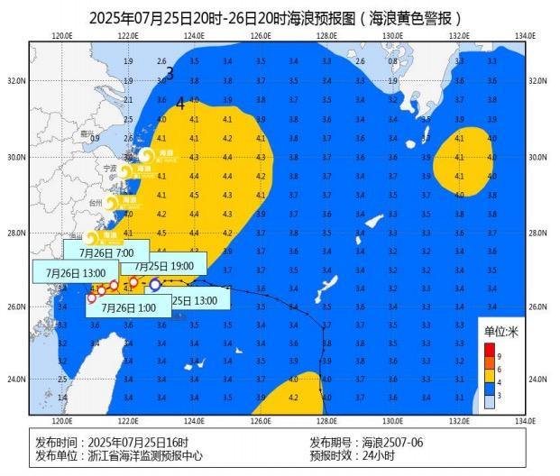 舟山、宁波、台州、温州近岸海域及普陀、嵊泗、岱山等多地的海浪预警级别均为黄色。海浪警报预计7月26日白天视情况解除。