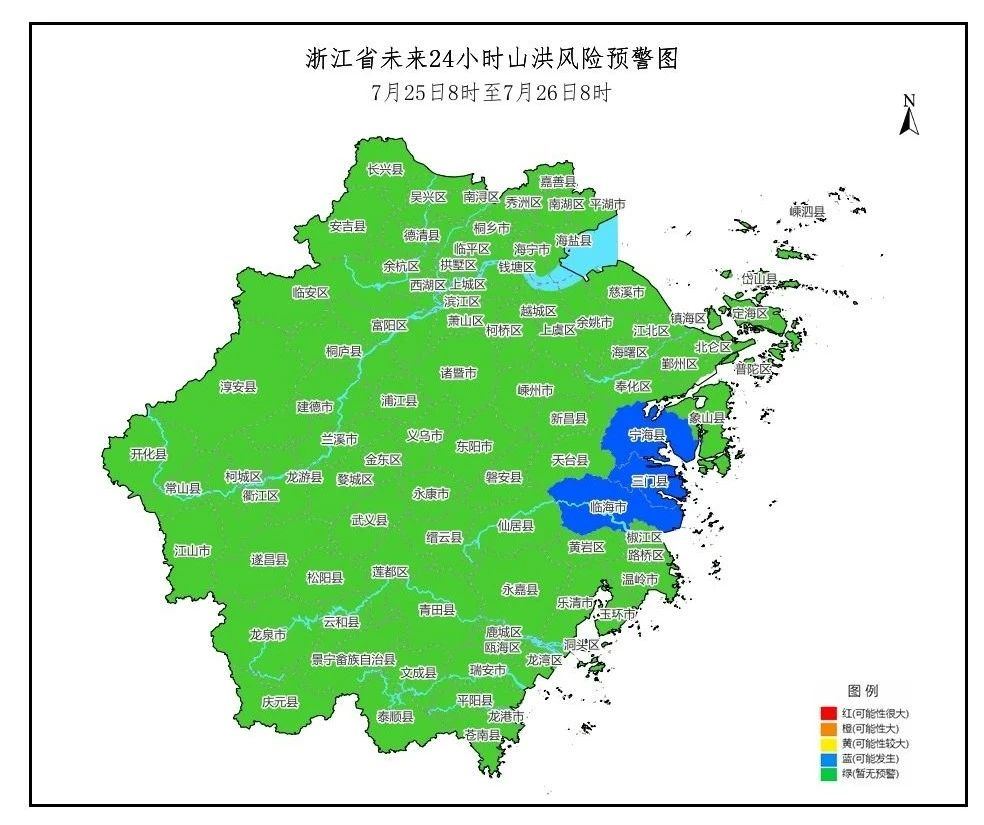 浙江省水利厅、浙江省气象局7时27分联合发布山洪灾害蓝色预警:预计25日8时至26日8时,宁海县、三门县、临海市可能发生山洪灾害(蓝色预警)。请密切关注天气形势及雨水情变化,注意防范强降水引发的山洪灾害。