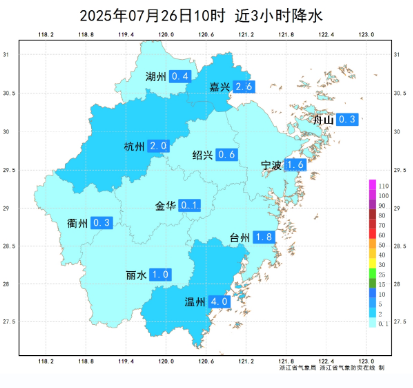 截至上午10点,近3小时雨量居前的温州,全市面雨量达到4毫米,泰顺、瓯海、鹿城等区县雨量较大。