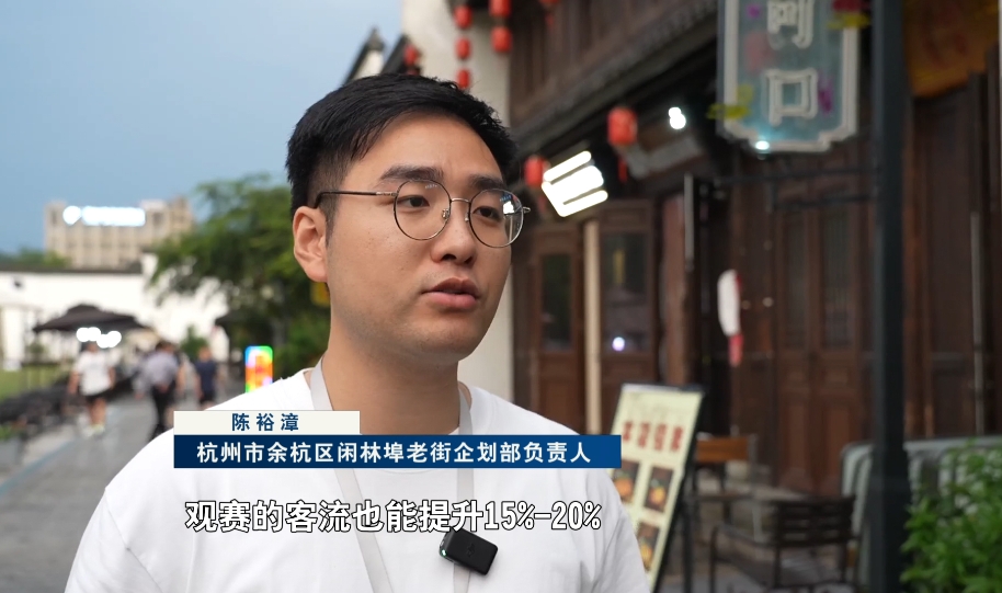 杭州市余杭区闲林埠老街企划部负责人 陈裕漳:观赛的客流也能提升15%-20%,销售额也能提升30%左右。还是计划长期去结合赛事规划,持续不断地在公共空间进行投屏。