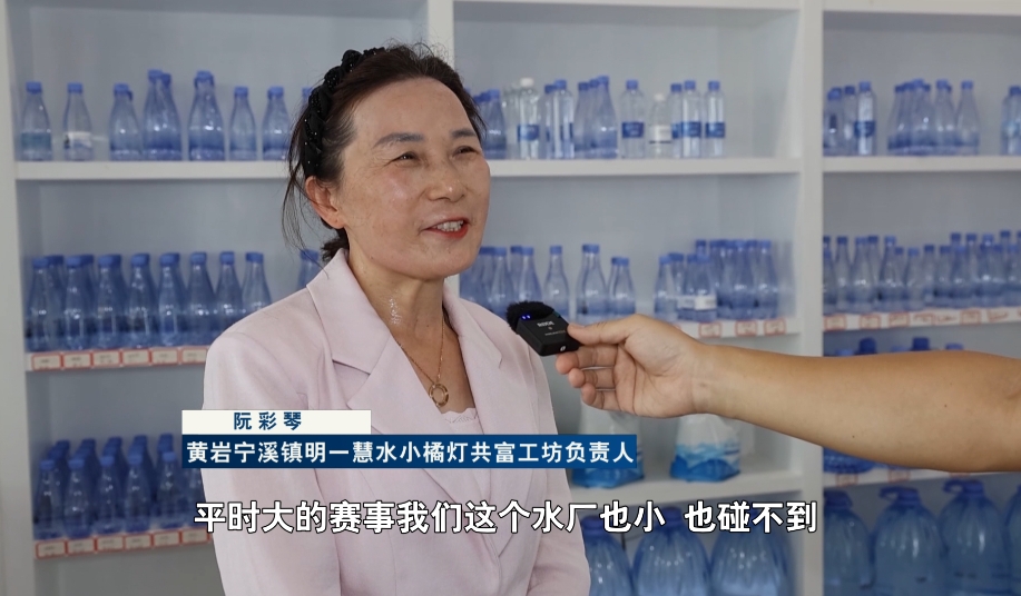 黄岩宁溪镇明一慧水小橘灯共富工坊负责人 阮彩琴:平时大的赛事我们这个水厂也小,也碰不到。借这次,把共富工坊的水做到全国各地。