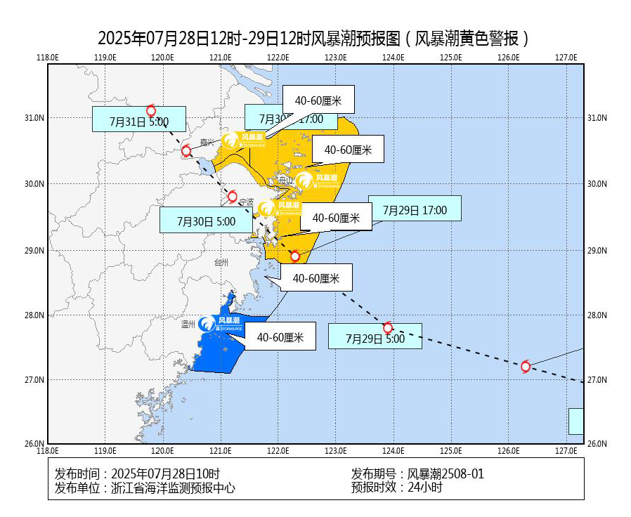 7月29日中午到30日中午,嘉兴、舟山、宁波沿岸将出现50到80厘米的风暴增水,台州、温州沿岸将出现20到40厘米的风暴增水。嘉兴、舟山、宁波市风暴潮预警级别为黄色。