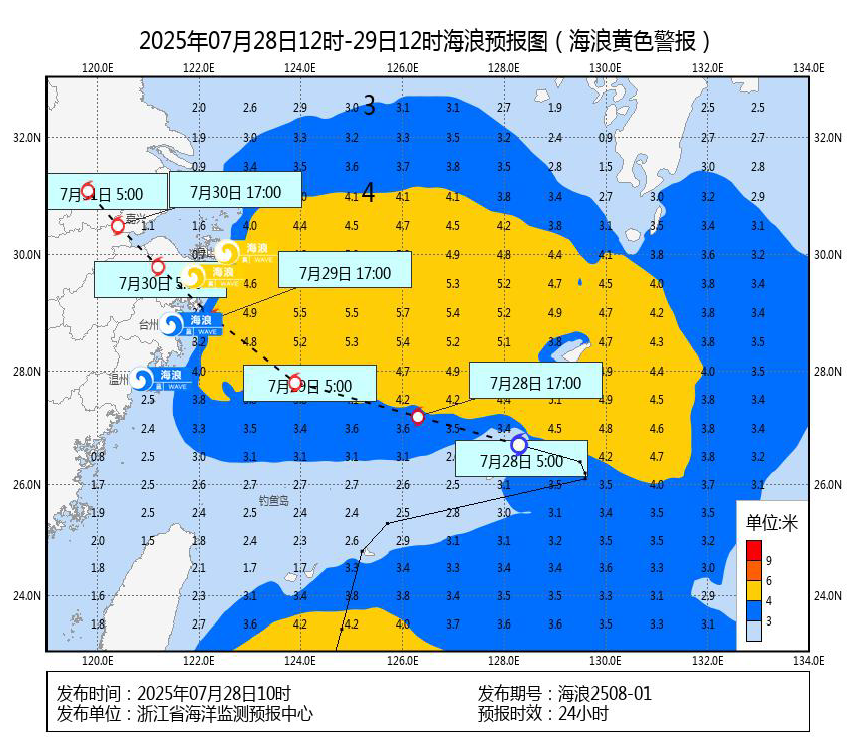 此次海浪过程主要影响区域为舟山、宁波近岸海域,严重影响时段为28日夜间到29日;风暴潮过程主要影响区域为嘉兴、舟山、宁波沿岸,严重影响时段为28日和29日晚高潮。