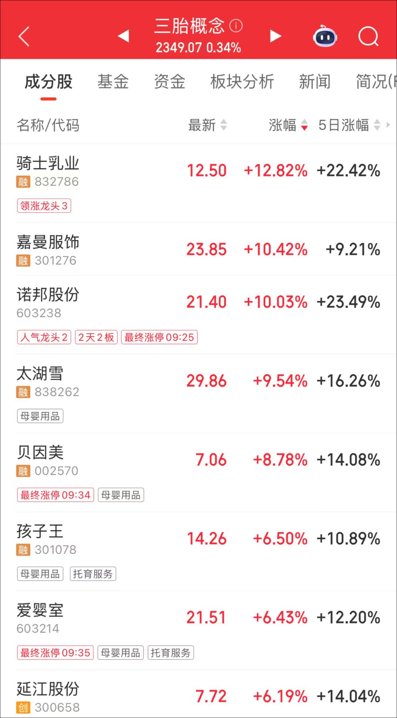 其中,骑士乳业涨超12%,嘉曼服饰涨停,与母婴零售相关的孩子王、婴幼儿纸品相关的中顺洁柔均大幅高开。