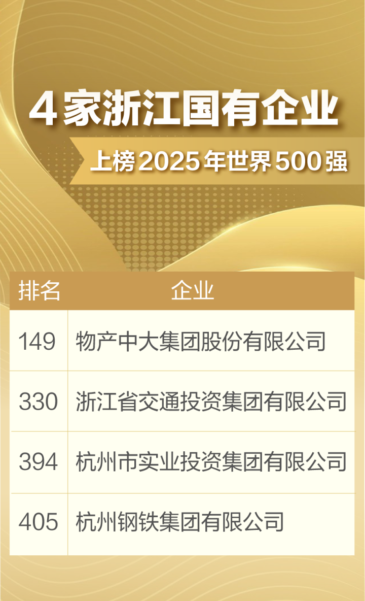 此外,浙江国有企业共有4家上榜。其中,省属企业3家,分别为物产中大集团、浙江省交通集团、杭钢集团;杭州市属企业1家,为杭州市实业投资集团。从具体排名看,物产中大集团连续15年上榜,以833.2亿美元位列149位;浙江省交通集团连续5年上榜,以459.7亿美元位列330位;杭钢集团连续4年上榜,以384.3亿美元位列405位;杭实集团连续两年上榜,以395.0亿美元位列394位。