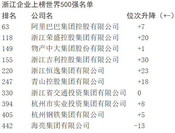 今年共有10家浙企入围榜单,上榜企业总数与去年持平。可喜的是,这10家企业的排名位次,有8家较去年均有提升,其中吉利的排名提升30位,恒逸集团提升23位、荣盛控股提升20位。欣喜之余,也可看到,今年中国500强榜单上的第11家浙企(万向集团公司)营业收入为297.18亿美元,距世界500强的门槛(322亿美元)差距也不大了。