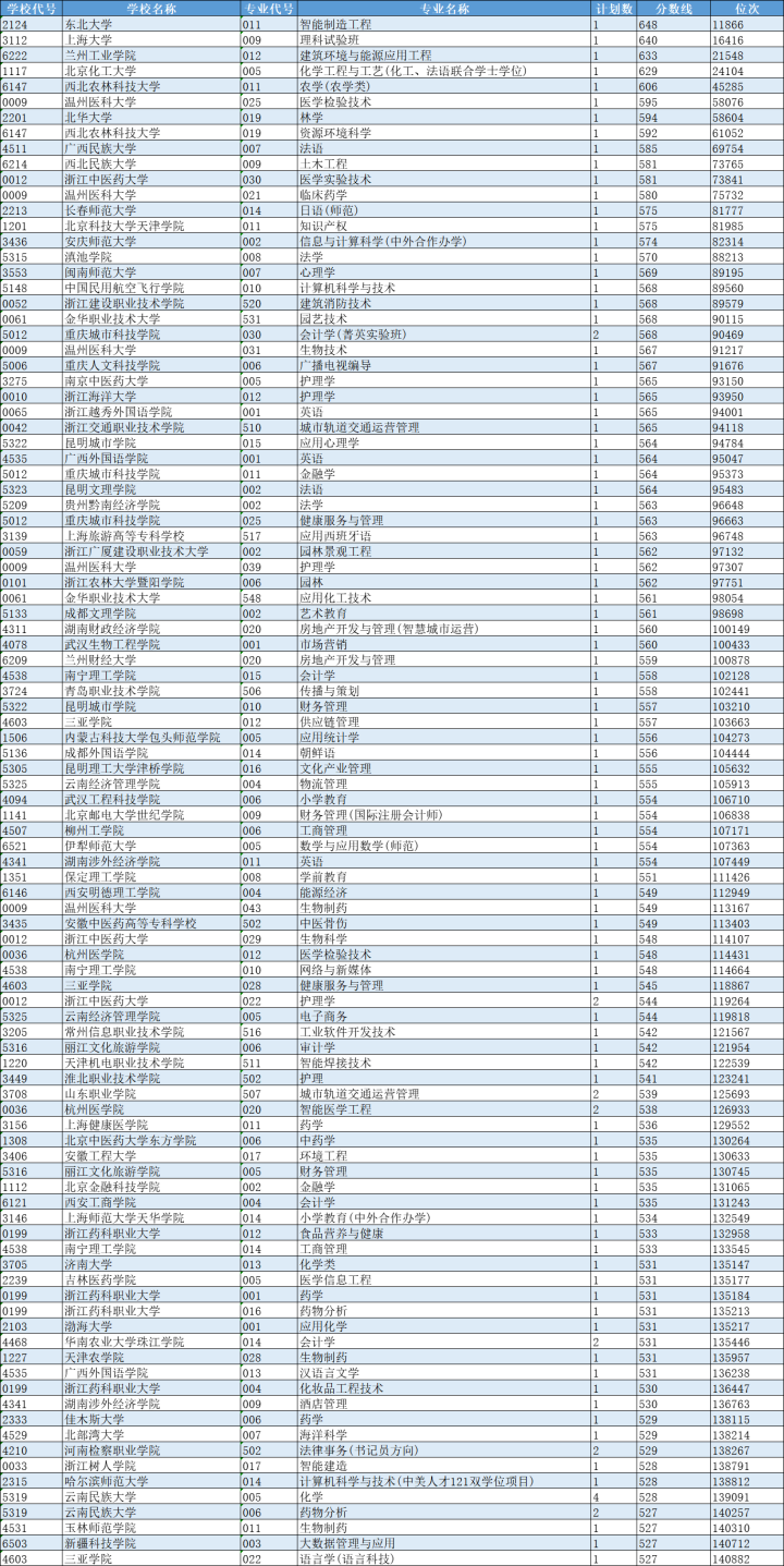 记者筛选了投档分数线排名前100位的专业,大多数都是本科院校,小部分是高职院校。录取专业涉及建筑环境与能源应用工程、化学工程与工艺、农学(农学类)、医学检验技术、林学、资源环境科学、法语、土木工程、医学实验技术、临床药学等本科专业,也有小部分高职院校的专业,类别非常多。