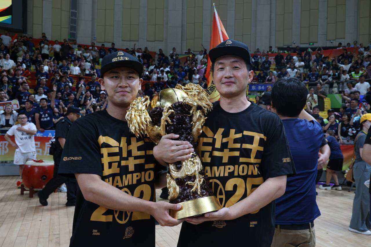 7月20日晚,“浙BA”金华赛区决赛现场,永康队队员举起冠军奖杯,经典的“双龙戏珠”造型,惊艳全场。图源:潮新闻
