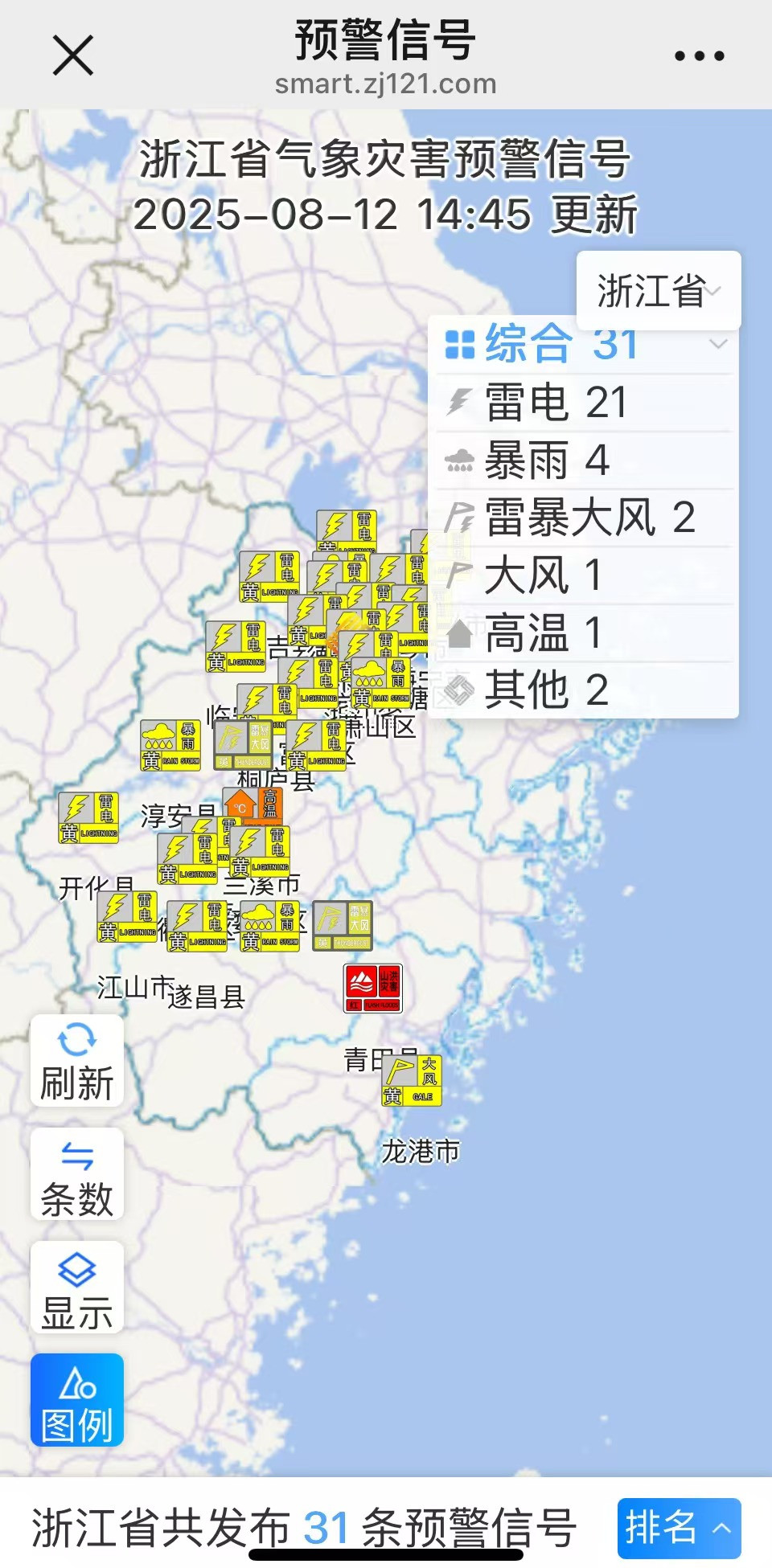 全省来看,今天浙北浙西部分地区有较明显阵雨或雷雨,雷雨时局地可伴有短时暴雨和8-10级雷雨大风等强对流天气。截至14:45分,全省共发布31条气象灾害预警信号,其中21地雷电黄色预警,4地暴雨黄色预警,2地雷暴大风黄色预警。
