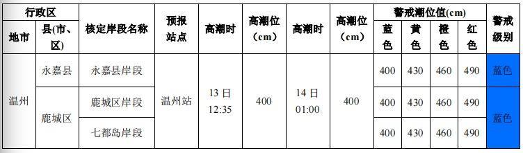 其中,台州、温州近岸海域海浪预警级别为蓝色,临海、椒江、温岭、玉环、洞头、瑞安、平阳、苍南等地海浪预警级别同步为蓝色。