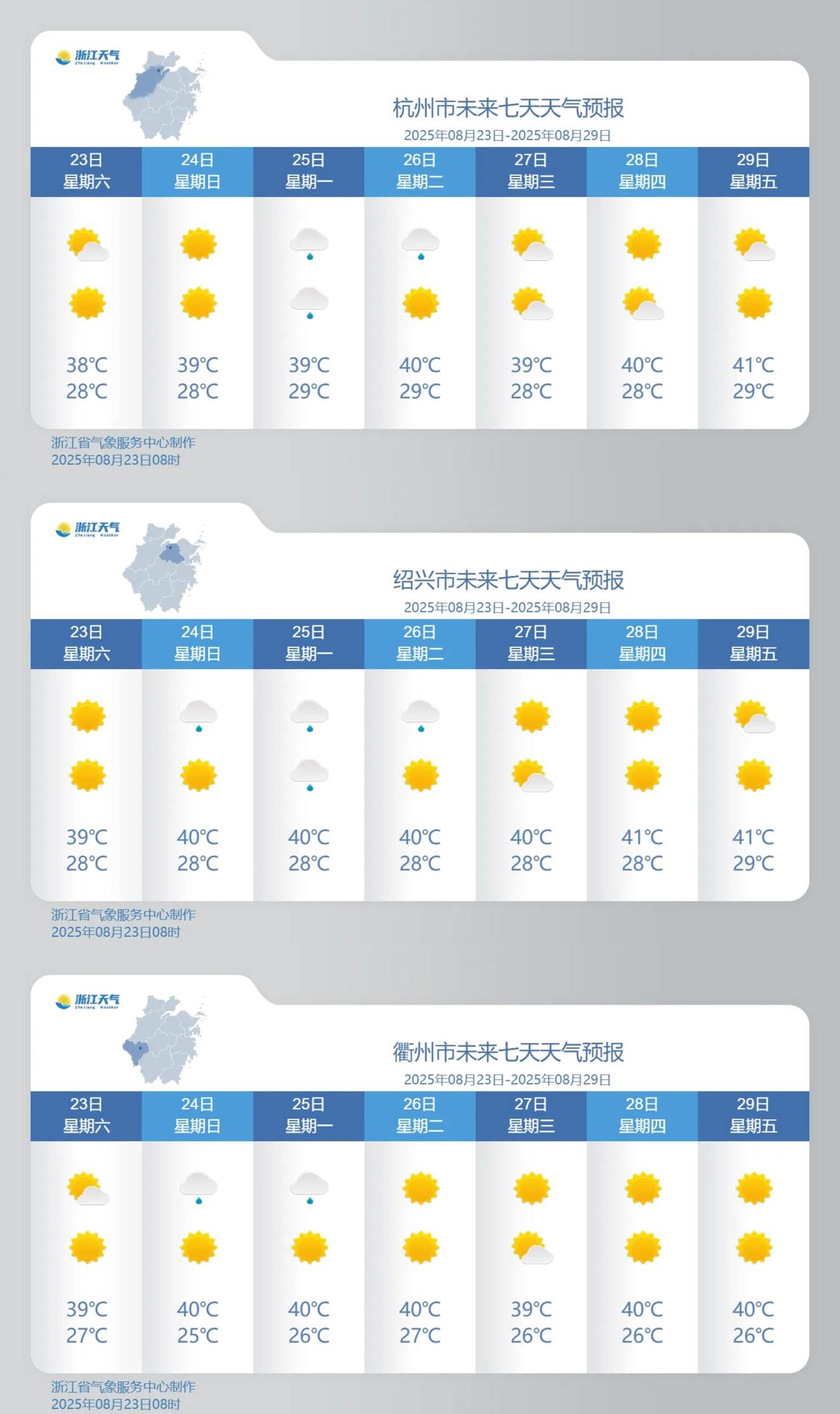 省气象台已给出预报,一直到8月底,36-38℃是标配,40℃甚至41℃的酷热也有可能局地出现,重点关注在杭州、绍兴、衢州地区。