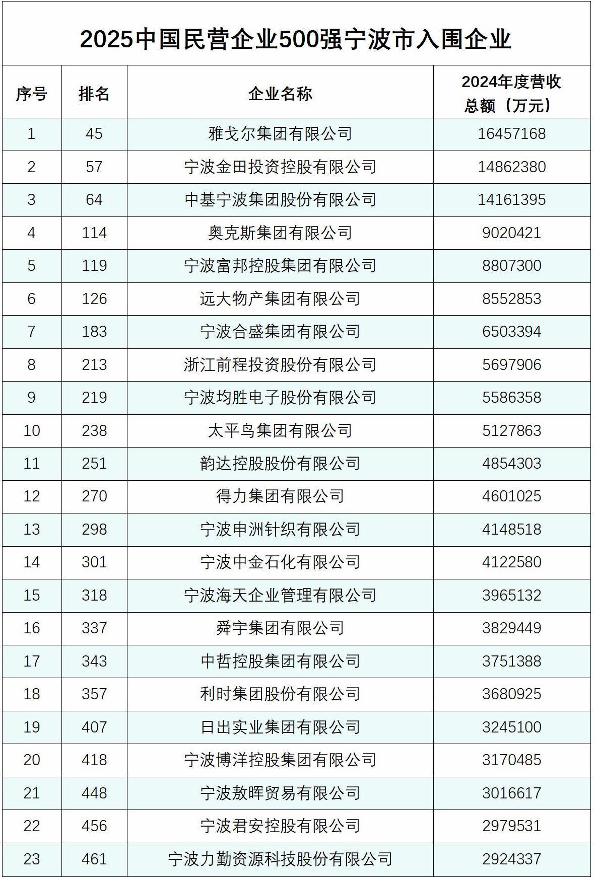今天,全国工商联公布了“2025中国民营企业500强”榜单,23家宁波上规模民企上榜,比去年增加1家,上榜数量创下历史新高。