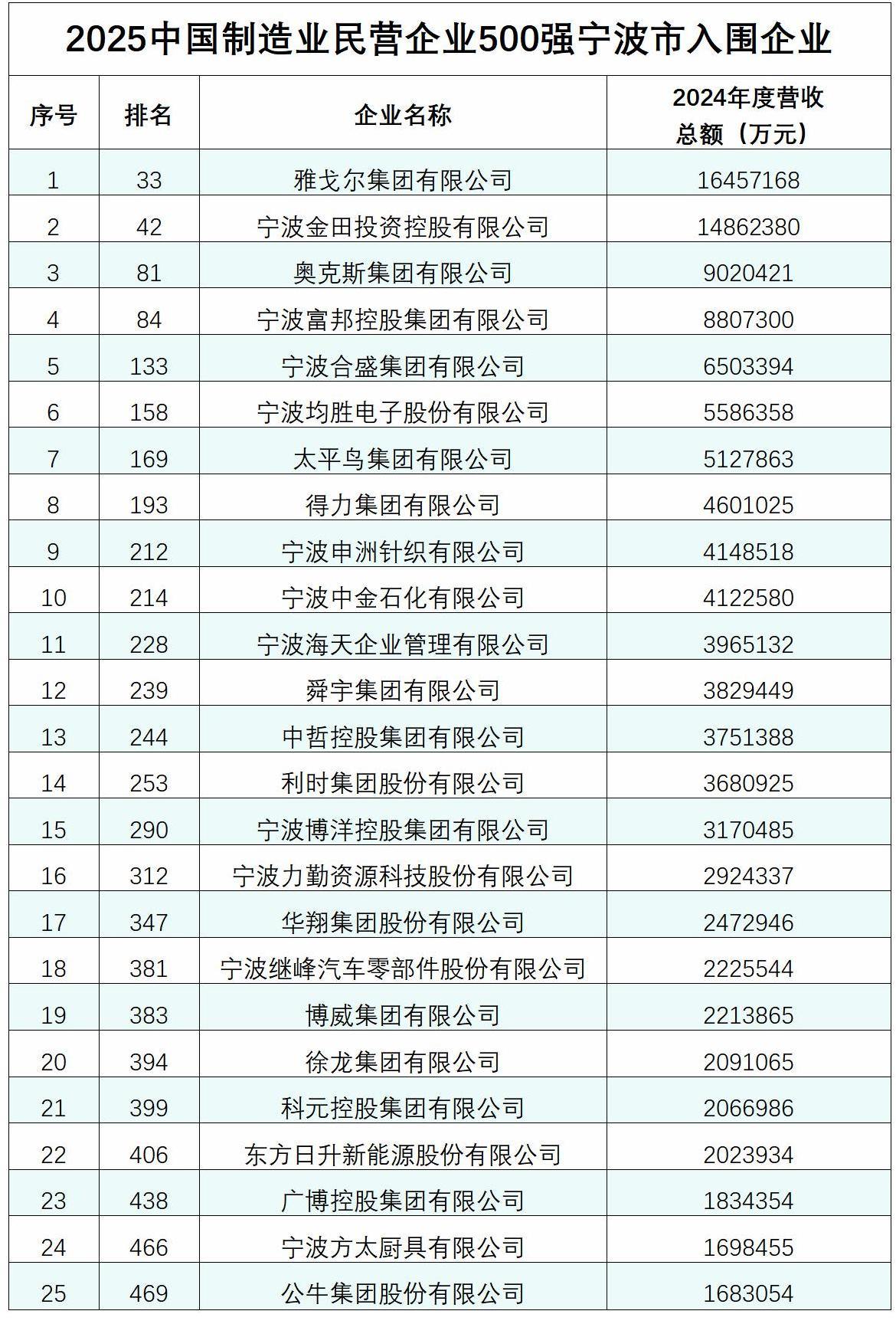 另有25家宁波上规模民企入围“2025中国制造业民营企业500强”榜单,5家宁波上规模民企入围“2025中国服务业民营企业100强”,入围企业数与去年持平。