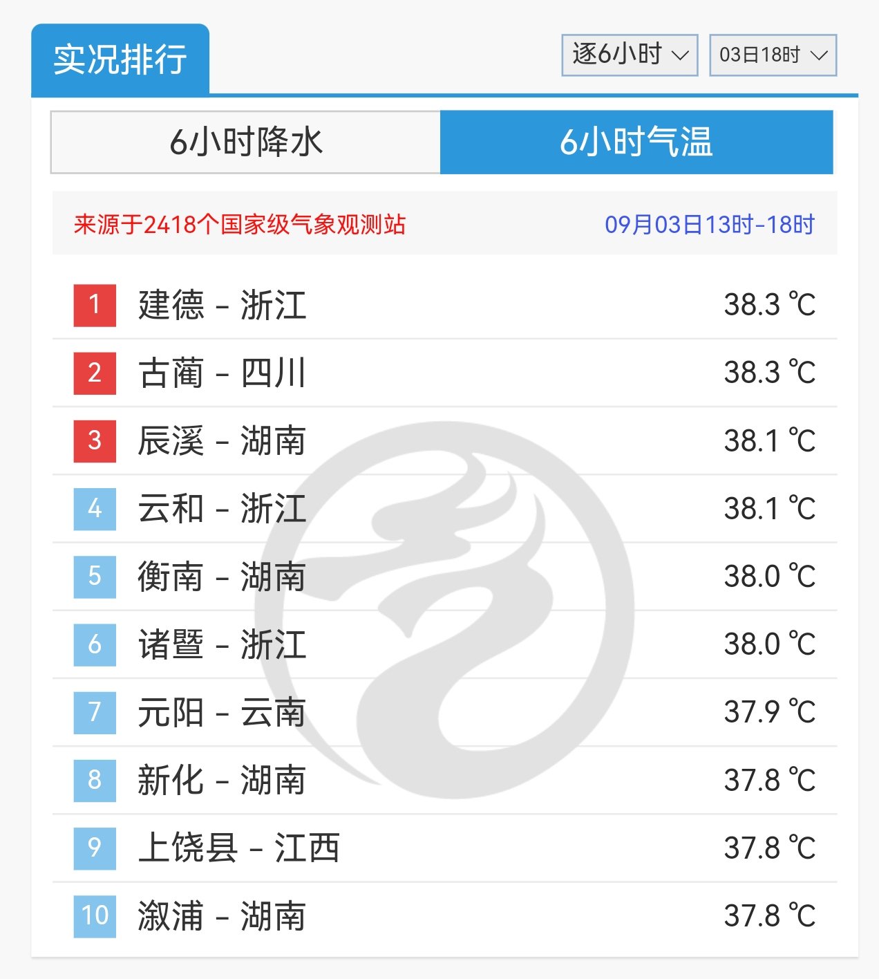 其实,昨天除了沿海地区以外,全省大部最高气温在35-37℃之间,像金华、丽水、衢州一带甚至是超过了37℃,建德更是以38.3℃拿下全国第一。